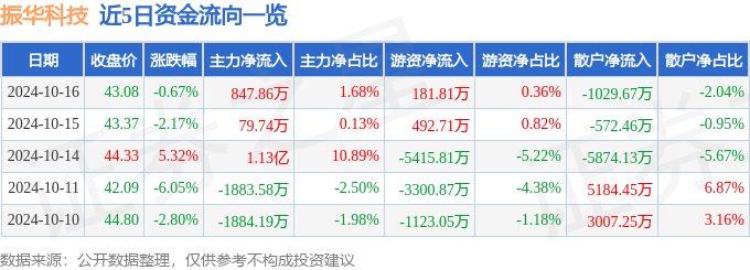 顶尖财经消息,截至2024年10月16日收盘,振华科技(000733)报收于43.08元,下跌0.67%,换手率2.11%,成交量11.71万手,成交额5.05亿元。