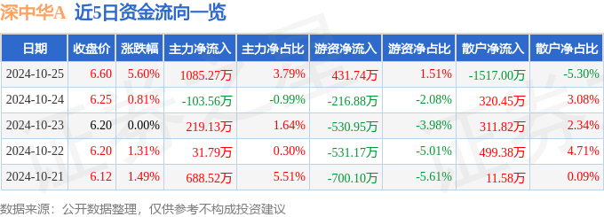 顶尖财经消息,截至2024年10月25日收盘,深中华A(000017)报收于6.6元,上涨5.6%,换手率14.44%,成交量43.75万手,成交额2.86亿元。