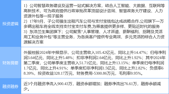 顶尖财经消息,外服控股9月10日涨停收盘,收盘价4.38元。该股于9点43分涨停,1次打开涨停,截止收盘封单资金为2535.34万元,占其流通市值0.55%。