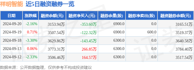 祥明智能融资融券信息显示,融资方面,当日融资买入295.81万元,融资偿还649.42万元,融资净偿还353.6万元。融券方面,融券卖出0.0股,融券偿还0.0股,融券余量6900.0股,融券余额11.57万元。融资融券余额3165.51万元。