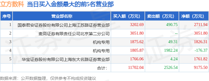 顶尖财经消息,沪深交易所2025年2月12日公布的交易公开信息显示,立方数科(300344)因日涨幅达到15%的前5只证券登上龙虎榜。此次是近5个交易日内第1次上榜。