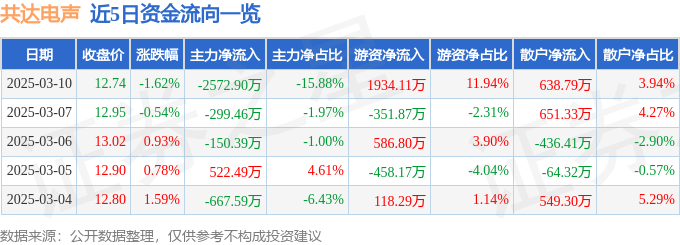 顶尖财经消息,截至2025年3月10日收盘,共达电声(002655)报收于12.74元,下跌1.62%,换手率3.53%,成交量12.7万手,成交额1.62亿元。