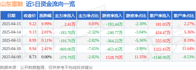 顶尖财经消息,截至2025年4月15日收盘,山东章鼓(002598)报收于9.22元,上涨0.99%,换手率3.07%,成交量8.67万手,成交额7992.55万元。