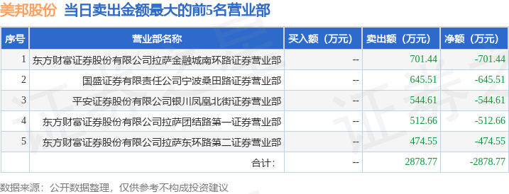 顶尖财经消息,沪深交易所2025年5月29日公布的交易公开信息显示,美邦股份(605033)因有价格涨跌幅限制的日收盘价格跌幅偏离值达到7%的前五只证券登上龙虎榜。此次是近5个交易日内第3次上榜。