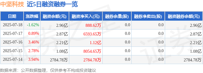 中坚科技融资融券信息显示,融资方面,当日融资买入4318.19万元,融资偿还3429.57万元,融资净买入888.62万元,连续3日净买入累计1.87亿元。融券方面,融券卖出0.0股,融券偿还0.0股,融券余量0.0股,融券余额0.0万元。融资融券余额2.96亿元。